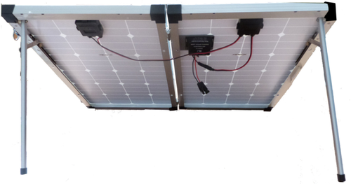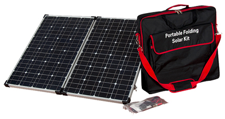 PORTABLE COMPLETE SOLAR KIT COMPLETE WITH 100W MONO-CRYSTALLINE PANEL, BUILT IN MPPT CHARGE CONTROLLER, FOLDABLE LEGS, CABLES AND CONNECTORS, AND CARRYING BAG.